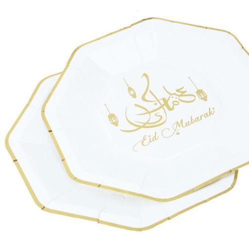 Set of 8 large Eid Mubarak paper plates in white and gold. Essential Eid party decor tableware. 23 cm diameter.