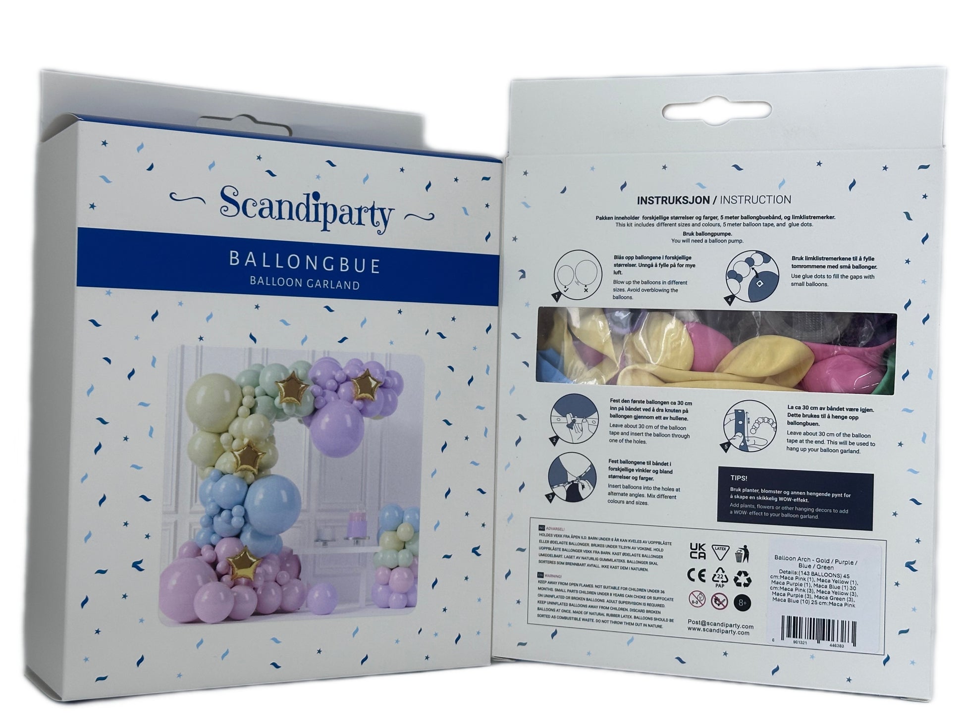 Maca pink (10), Maca yellow (10), Maca purple (10), Maca green (10), Maca blue (10), Glue dot (1), Balloon chain (1)
