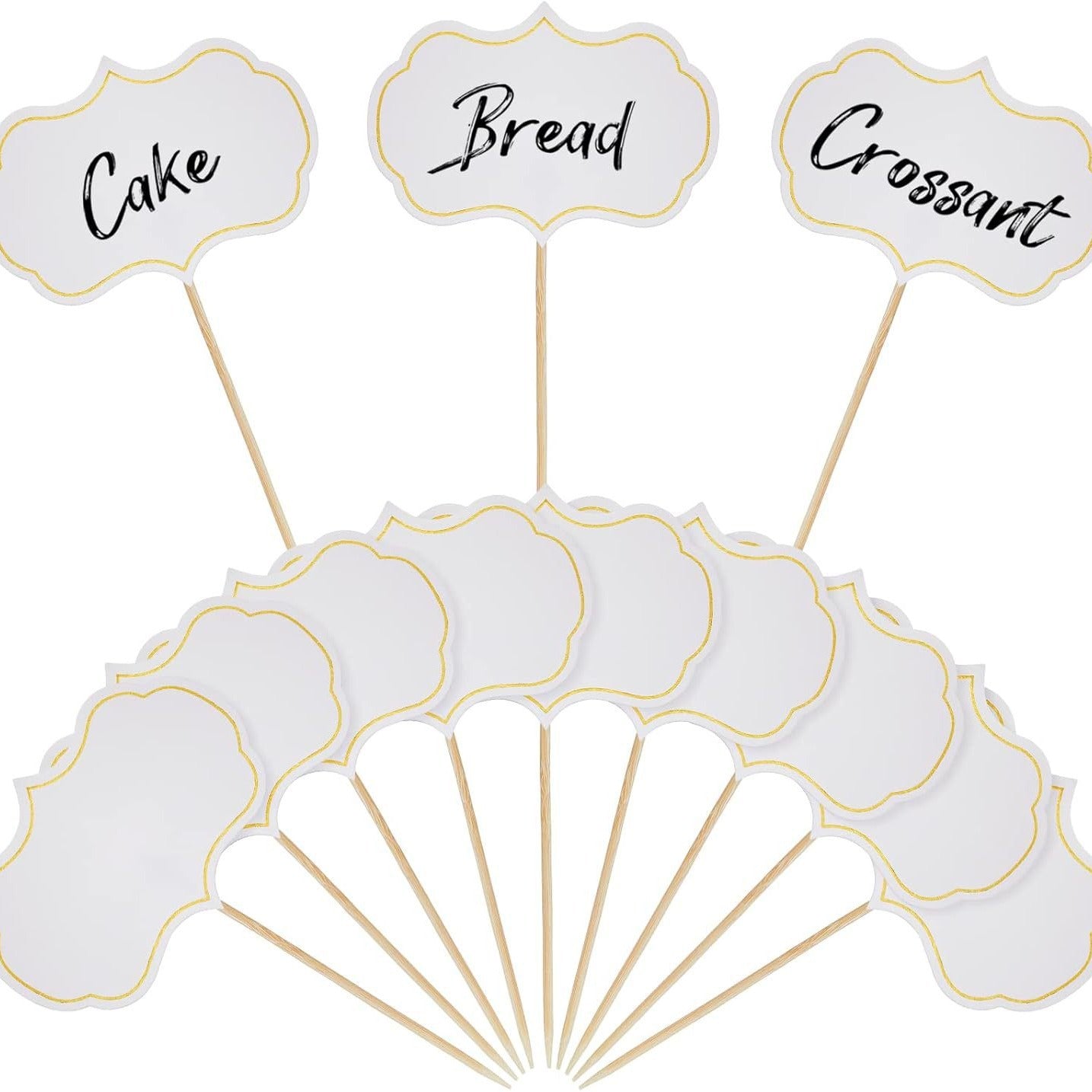 Blank cake topper flags made of sturdy paper, perfect for writing personalized messages. Each set includes toothpicks and glue dots for easy assembly and use on cakes, desserts, or party buffets.