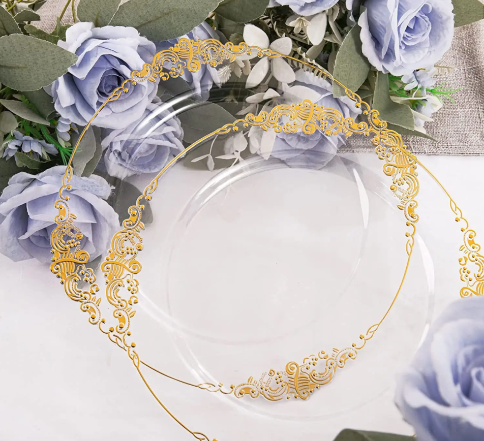 Imponer gjestene med våre hvite og sølvfargede plasttallerkener. Disse fancy platene er slitesterke, men likevel engangs, og gir en problemfri, rimelig løsning for enkel rengjøring etter arrangementet. Perfekt for bryllup.