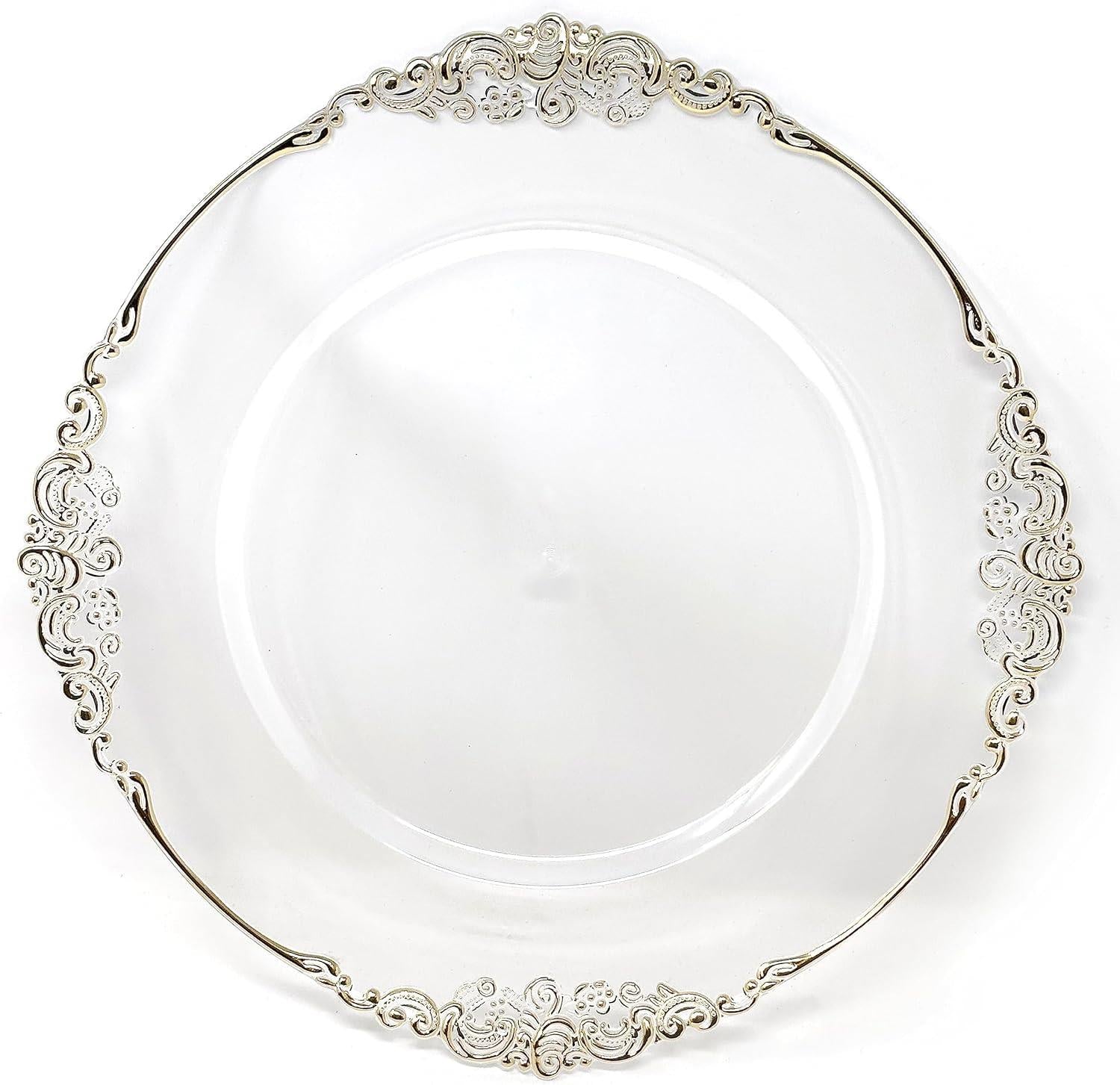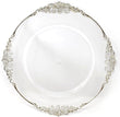 Imponer gjestene med våre hvite og sølvfargede plasttallerkener. Disse fancy platene er slitesterke, men likevel engangs, og gir en problemfri, rimelig løsning for enkel rengjøring etter arrangementet. Perfekt for bryllup.