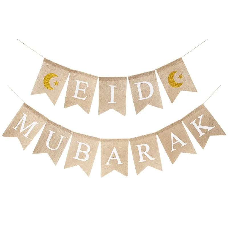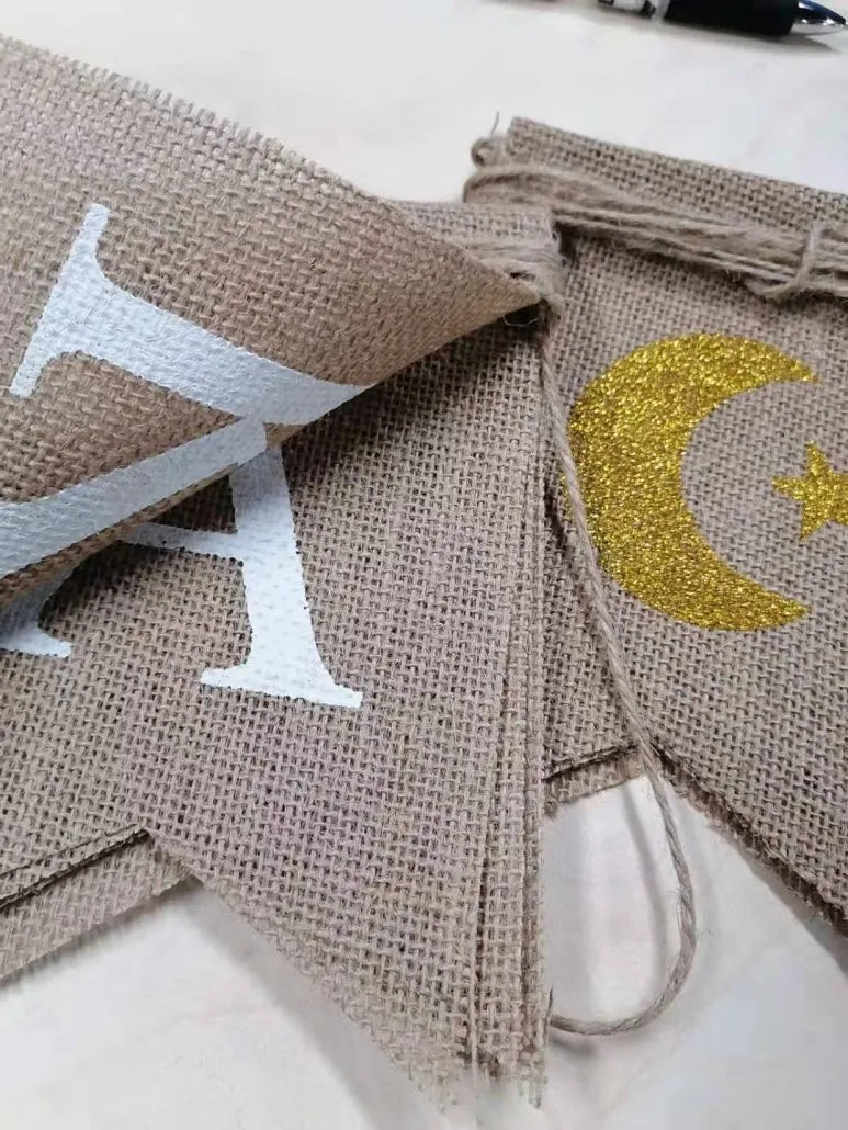 Slitesterk og gjenbrukbar: Dette Eid Mubarak-banneret er laget av naturlig jute, hvert flagg er 5" x 7", brettes lett for oppbevaring og ikke lett å bryte, du kan bruke det flere ganger
