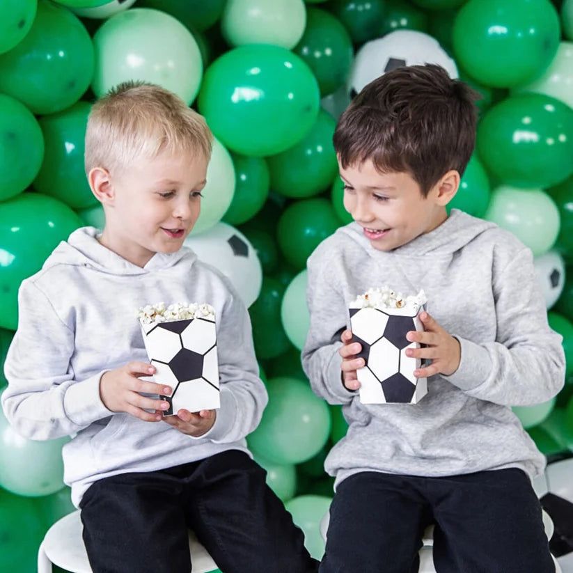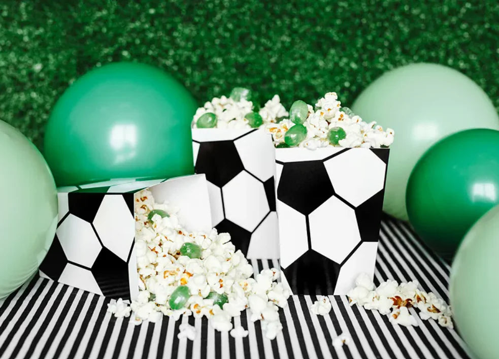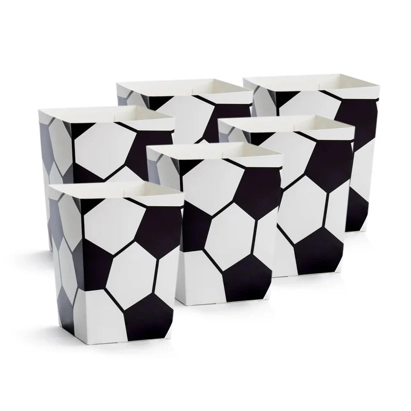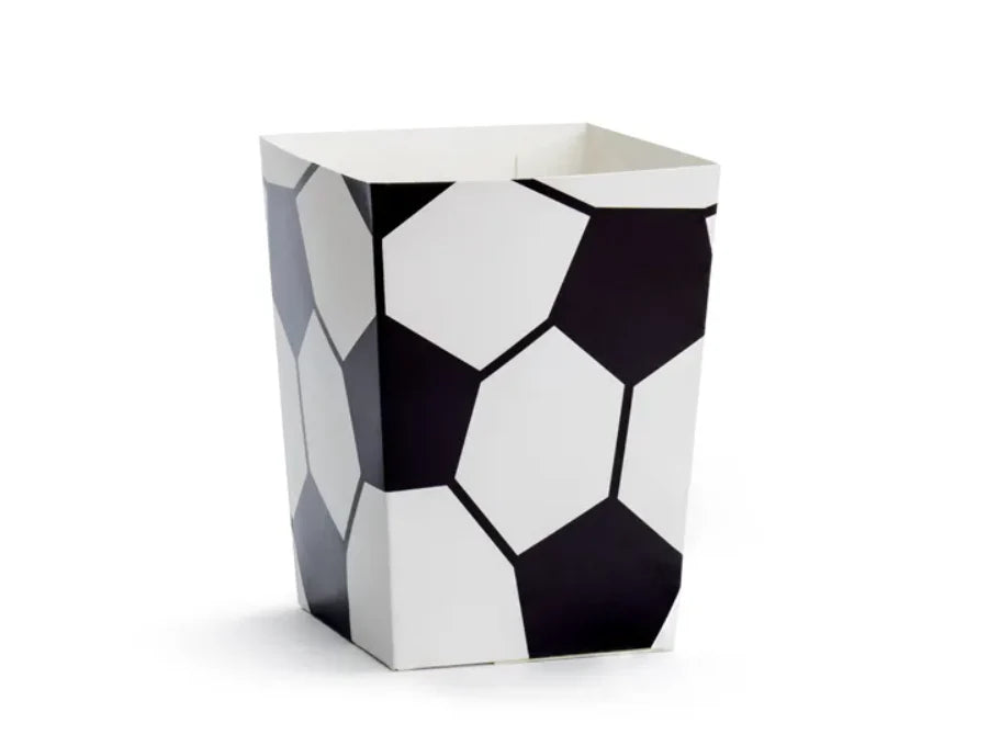 Esker til popcorn Fotball i hvit farge med svart trykk, størrelse etter montering ca. 7 x 7 x 12 cm.