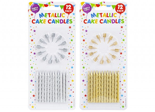 Metallisk pakke med 12 lys med matchende holdere, rask og enkel måte å dekorere en bursdagskake, feiringskake. Metalliske stearinlys med holdere. Pakke med 12. 60 mm.